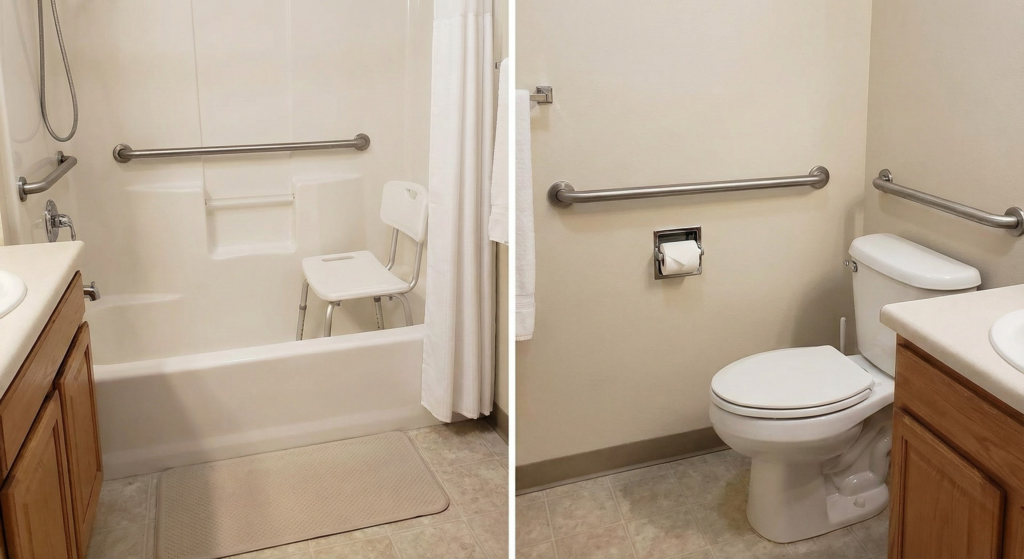 - Grab Bars are Non-Negotiable: Do not rely on towel racks; they are not designed to support human weight. Install ANSI-compliant grab bars in the shower and near the toilet.